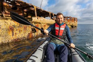 On calm days, when the waves are small, it’s easy to set the kayak in the water in the sandy bays and paddle out to the rusting wrecks. Because the water in the Atlantic is so clear, you can inspect much of them from the surface without having to get in the cold water. We enjoyed kayaking on the shore of the Orkney Islands; apart from the Caribbean-like beaches and the interesting sights, you might also encounter curious seals swimming around you and popping their head out of the water to say hello.