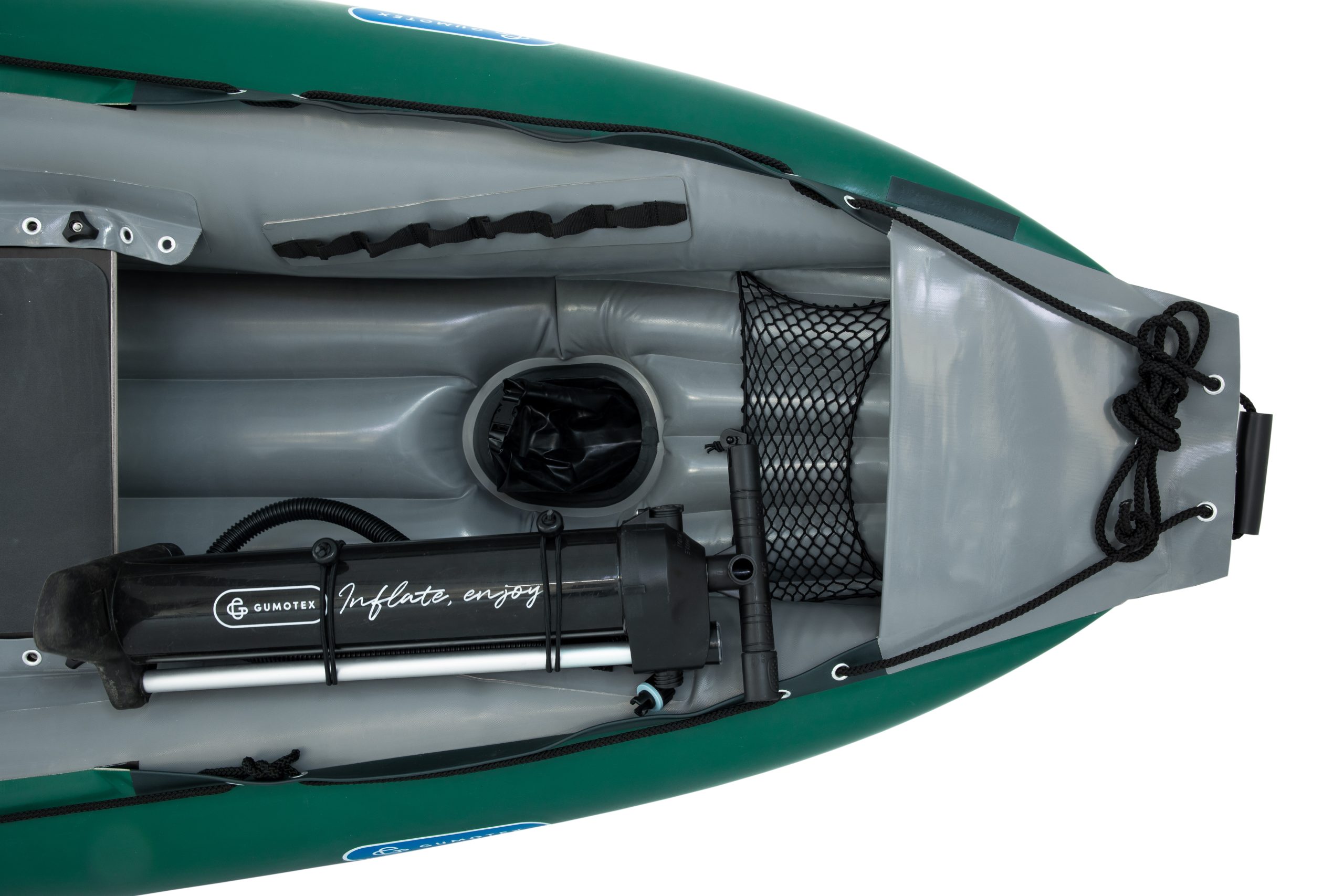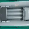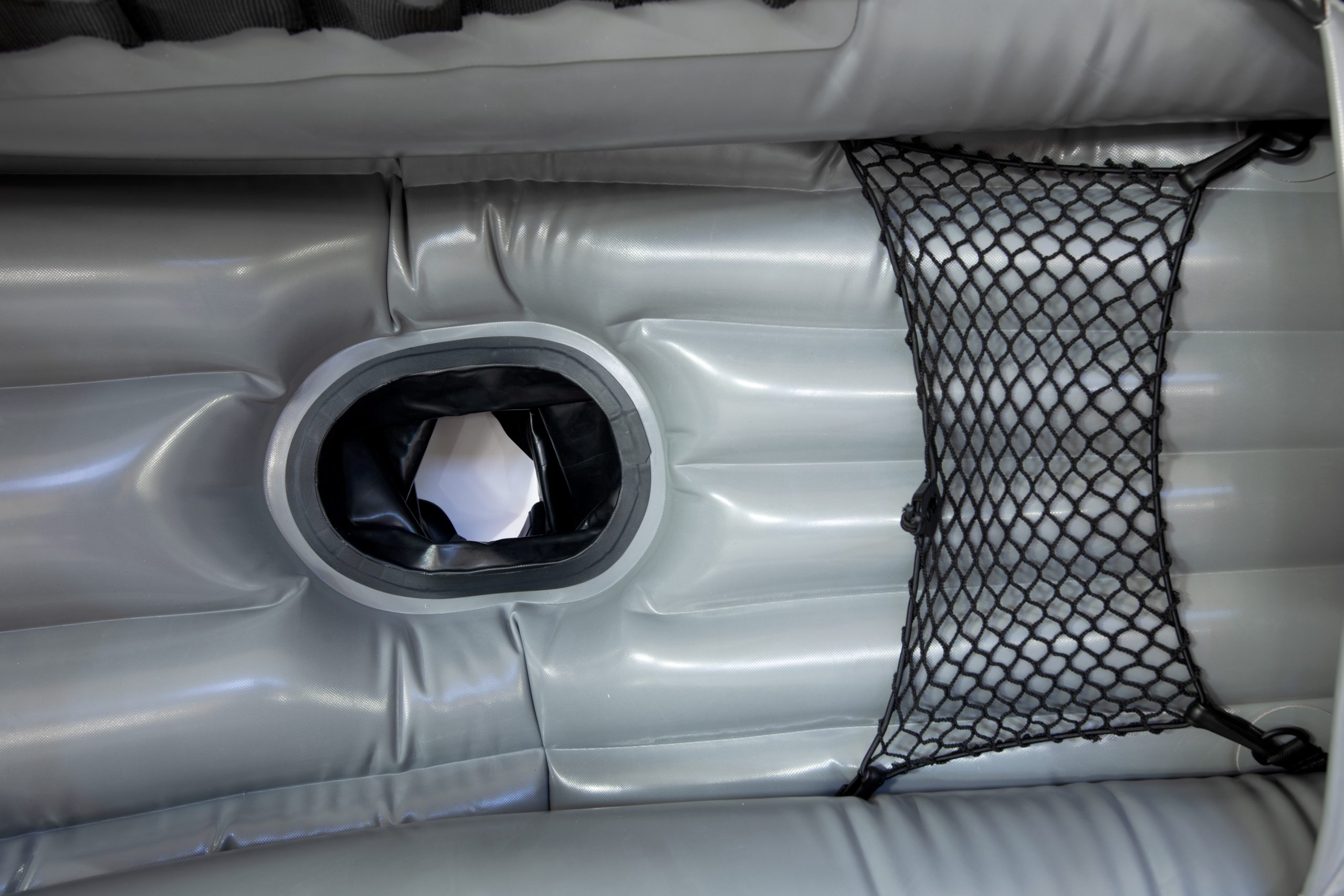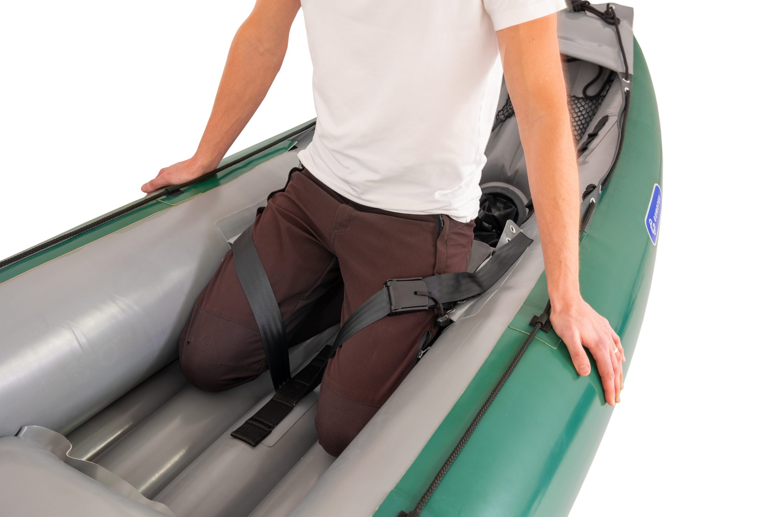 b) The model’s width (10 cm greater than that of the Scout), as well as the width of its inflatable bottom, which extends under half the thickness of the sides, thus considerably increasing buoyancy.