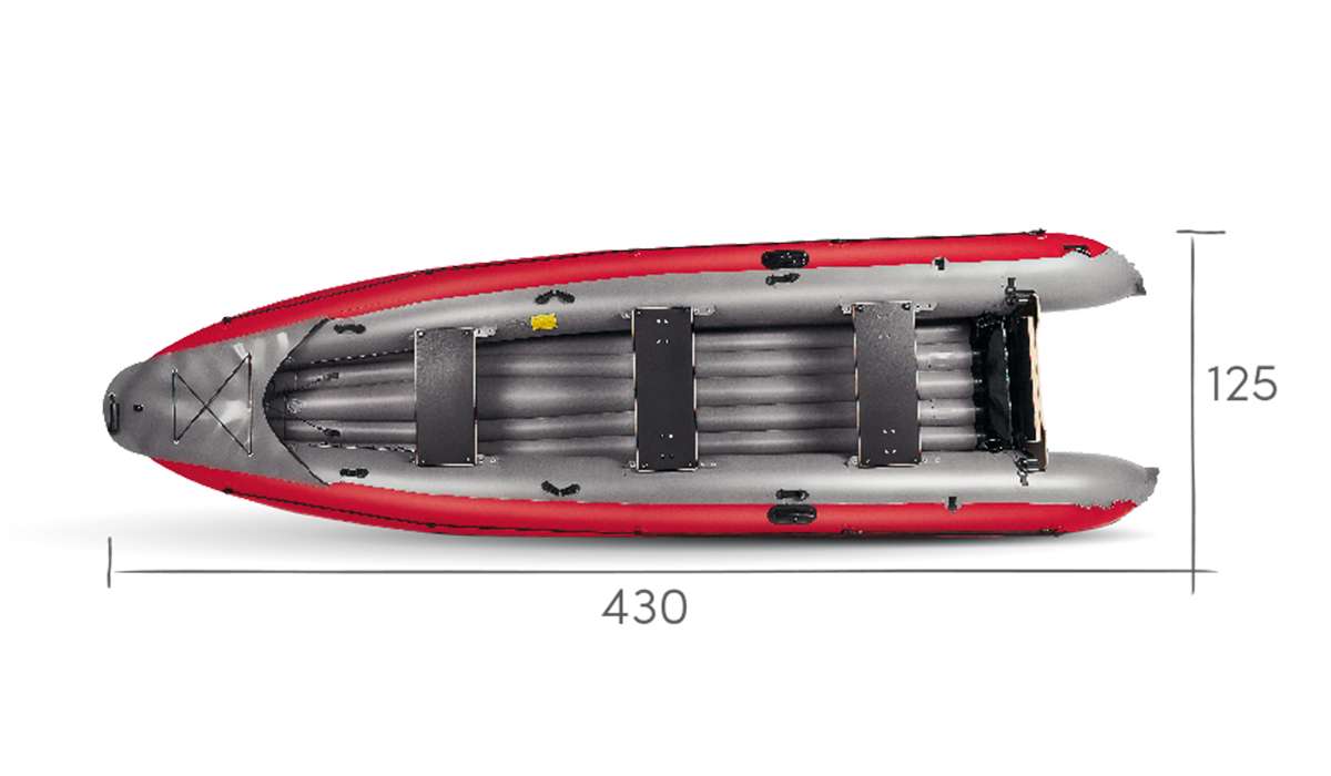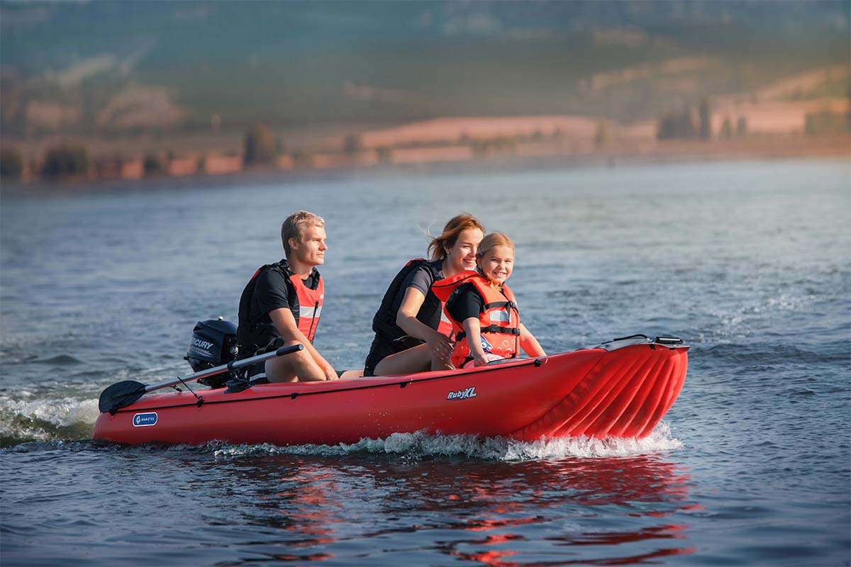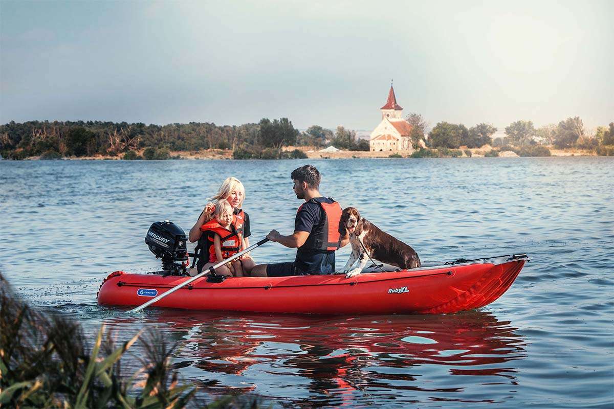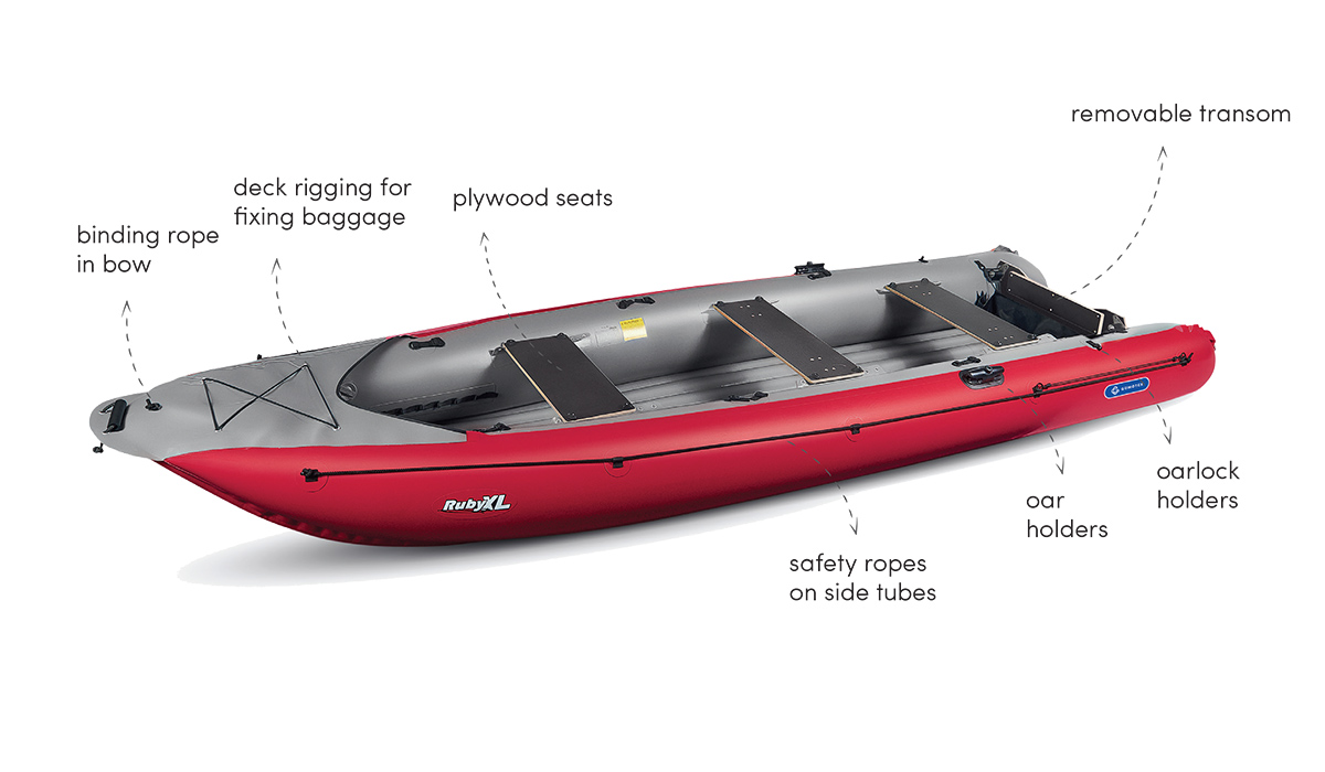 The new, larger boat RubyXL is 17cm wider than the original version while maintaining an excellent handling performance. It can be used with oars, with paddles as a canoe, or with a motor*. The fastening of the transom has also been changed, which is now much more robust and can be fitted with a motor with the maximum power up to 5 hp = 3.7 kW. The RubyXL boat is suitable for recreational offshore travelling, or just trips on lakes and quieter watercourses. With canoe paddles, without motor and oars, this boat can be used for river travelling up to the WW2 difficulty class.