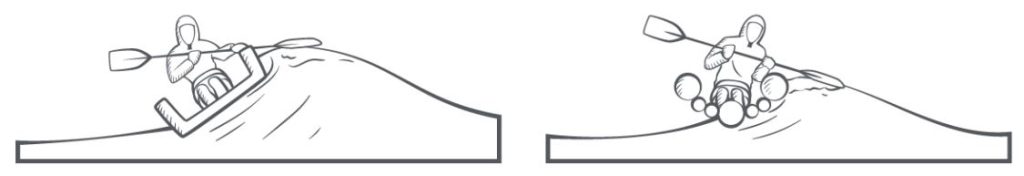 Left picture: The flat, vertically chined bottom of kayak, (here a wide-bottomed “Full-HP”) tends to stick to the downward face of the wave, and tip over when it rolls or breaks.