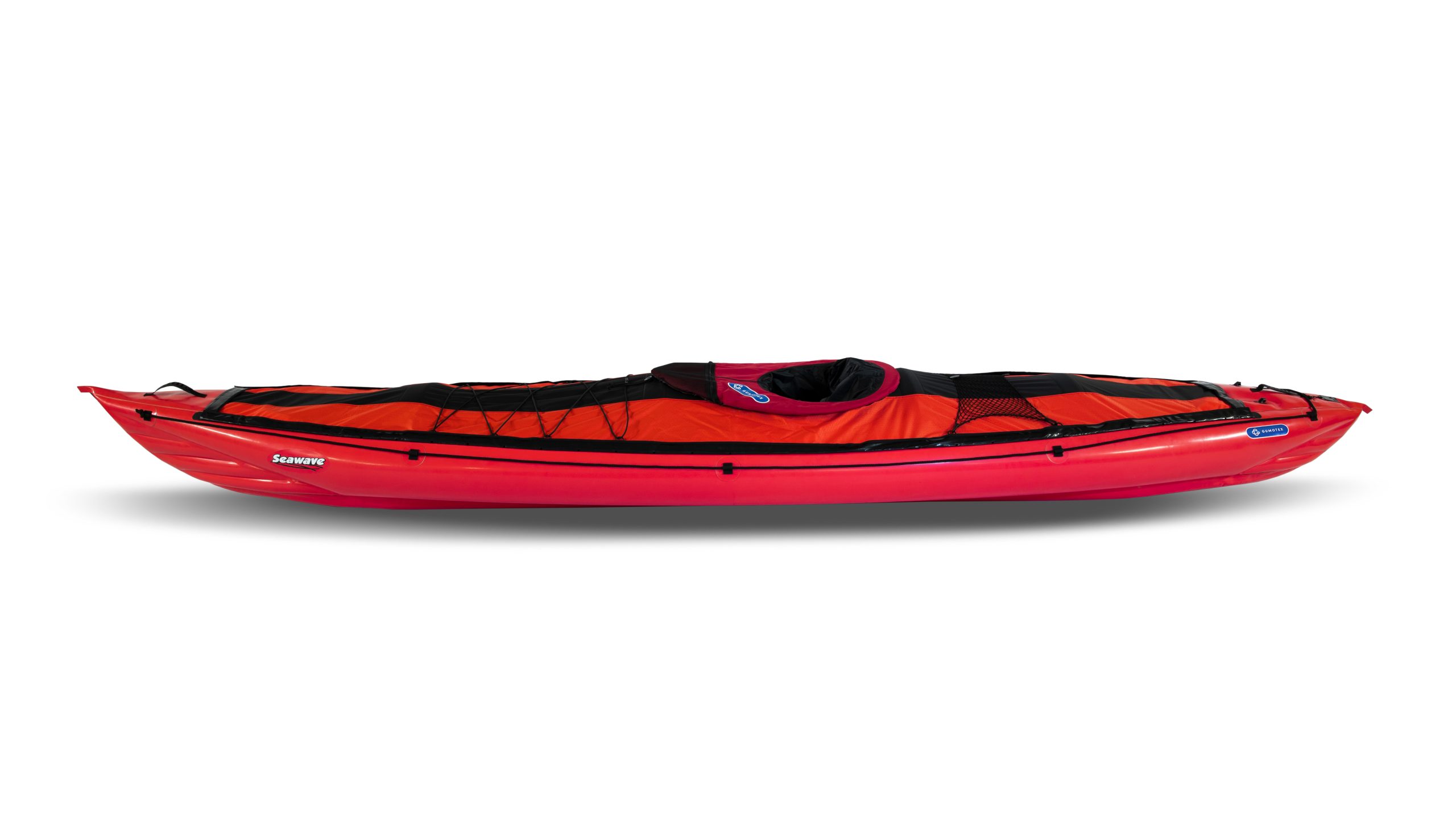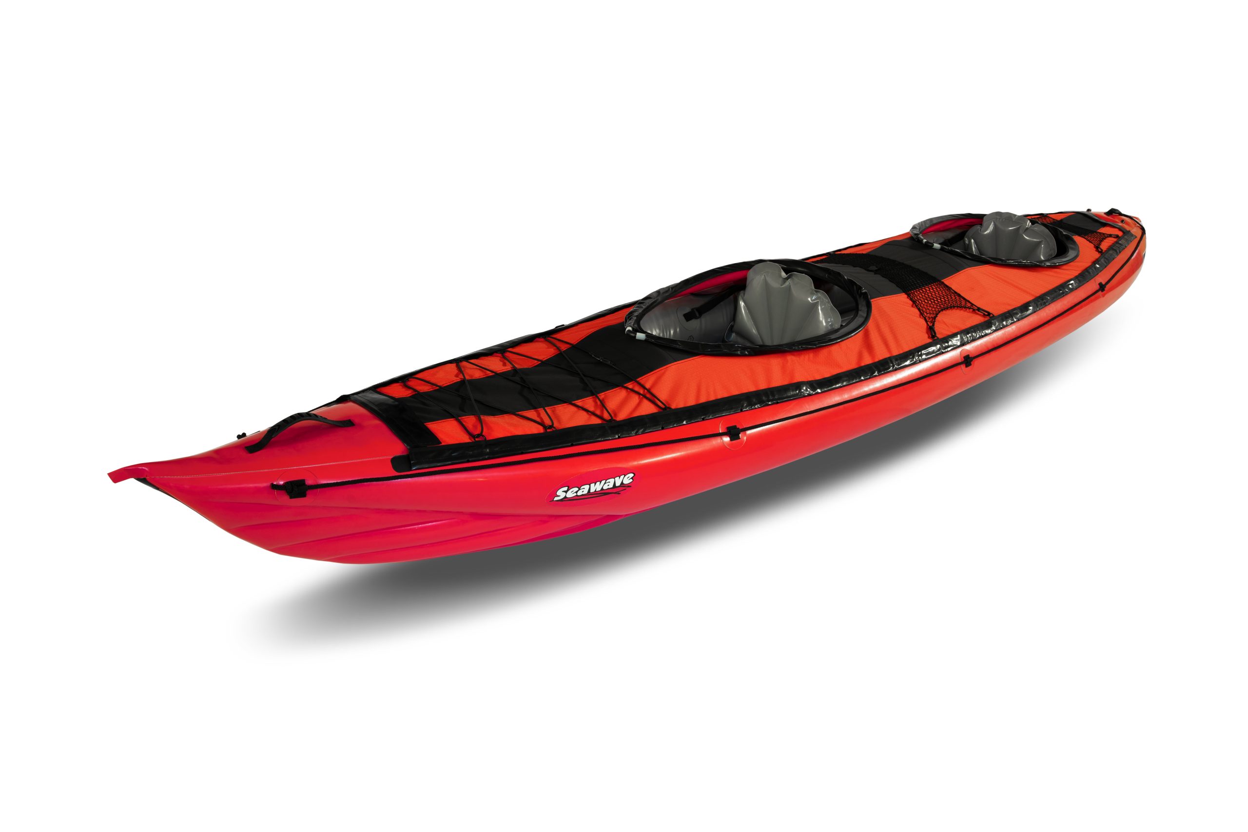 Seawave is one of a few inflatable kayaks featuring a pronounced, unyielding curvature under the side tubes. This is the key element in the shape of the hull: it enables the SEAWAVE to climb waves and/or swell, without just bumping into or passing through, but instead following the wave’s ascending or descending line with fluidity, without loosing the speed generated by the paddler(s). This curvature is determined by the assembly angle, hand made during the production, with a constraint maintaining the longitudinal curvature of the two air chambers.