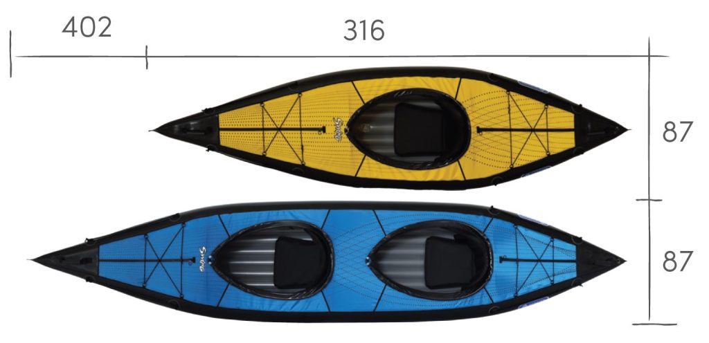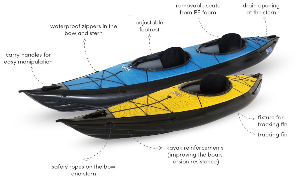 SWING 2 is a sit-in inflatable kayak great for relaxing trips on sheltered waters, harbours, lakes and rivers up to Gr. 2 white water. The kayak is supplied with three aluminium reinforcements for improved rigidity of the hull, maneuverability and stability. The reinforcements also shape the deck of the kayak. Thanks to its low weight the kayak is perfect for trips with frequent portages. The enclosed deck prevents water getting in. The kayak is available in a single and a double version.