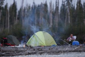 Camping along the way was sumptuous. We could choose between the shade of the forest and soft, fragrant moss or a sunny spot on a wide bank with warm, soft pebbles. At hand was both clean water and dry driftwood, which the industrious beavers had prepared for us in such a way that it could be placed directly on the fire. Evenings and mornings were above average warm. During the day, temperatures were over twenty degrees in the shade, and uncomfortably hot in the sun. We experienced fog only one morning. Unpleasant smoke from a forest fire that broke out somewhere, perhaps a hundred kilometers away, fortunately only bothered us for one afternoon and one evening. The birds fell silent and the smell of the crematorium hung over the region. White ash flew lightly from the sky to the ground, and if it weren’t for the sweltering heat, one could believe it was snowing. The sun was drowning in smoke, and a strangely sad mood spread over the region. Fortunately, the direction of the wind changed during the night and there was no sign of the smoke in the morning.