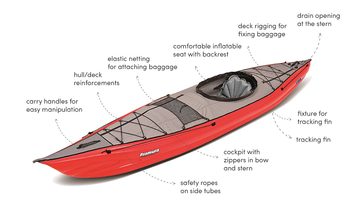 FRAMURA has 2 storage compartments one at the bow and one on the stern. The kayak has a non-removable deck with elastic netting and is supplied with a comfortable inflatable seat.