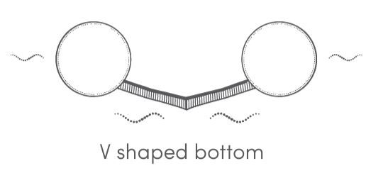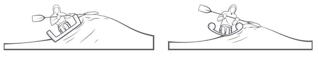 Right picture: The narrower, V-shaped bottom and rounded chines of kayak (a Seashine) allow the paddler to heel against the wave, thus avoiding capsizing.