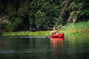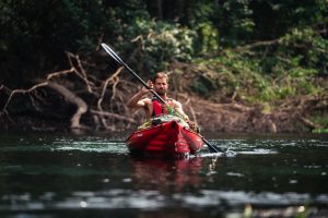 I started using this robust and large kayak after I had paddled many years and many thousands of kilometers on a Gumotex Helios. I suspected that this higher class would bring with it more improvements and new possibilities, and I was right. The first time I used the new boat was in my second home – on the Leboulou and Niari rivers in the Congo Basin in Central Africa. After unpacking the boat from its waterproof carry bag (which provides plenty of room for other accessories, which always comes in handy in the field), the red-and-gray strap-tied beauty lay in front of me. It was a shame to unroll it in the mud… Four and a half metres long piece was perhaps surprisingly compact and light when folded. Therefore, handling it is easy even for one person and this time I was sailing the boat alone. Once unfolded, finding the valves to the main three chambers – the bottom and sides – was easy and straightforward. Their location is also reachable from the boat, and unlike some previous Helios models, these are not in a place where they might get in the way or push the kayaker in certain positions. That is not a concern now. Next up are the separate, adjustable and stable backrests, which are easy to adjust with the straps, and just like the inflatable footrests, installation is intuitive. The seat has a high enough backrest for my taller stature (almost 190 cm) and the boat was comfortable even after several days of intense paddling. The very furthest bow and stern of the boat is covered from above and offers the possibility of partially inserting, for example, a water canister, a tent, a backpack or even a watermelon! The boat is easy to handle when carrying (or even pouring water) by both one or two people. It can be nicely slung over the shoulder of one carrier or carried by two by the solid handles in the front and back. On the water, the boat is very solid and it doesn´t look like inflatable boat at all. It is dynamic, responding quickly to the kayaker’s cues. Its stability is excellent. I had it filled with a large suitcase with electronic equipment, a full crosse, 10 liter water bottle, pot, shoes, tent, tripod, machete, and food supplies for several days. All of this was no problem to stack in the places in front of and behind me and to secure it thanks to the longitudinal side ropes. The tying down was more out of habit, as the boat actually still held its position and stability. Its surface is very pleasant to touch and it is evident that it is made of strong and solid material. Numerous runs aground or even sharper broken branches underwater have left no marks on it at all. It is easy to turn the boat around during the sailing or even to climb over to the front if it is empty. It allows a really wide range of activities and uses. If necessary, a fixed black directional fin can be installed with a few moves to better maintain the course. In short, I felt comfortable, safe and somehow privileged on the Seawave kayak – because it really is a joy to paddle.